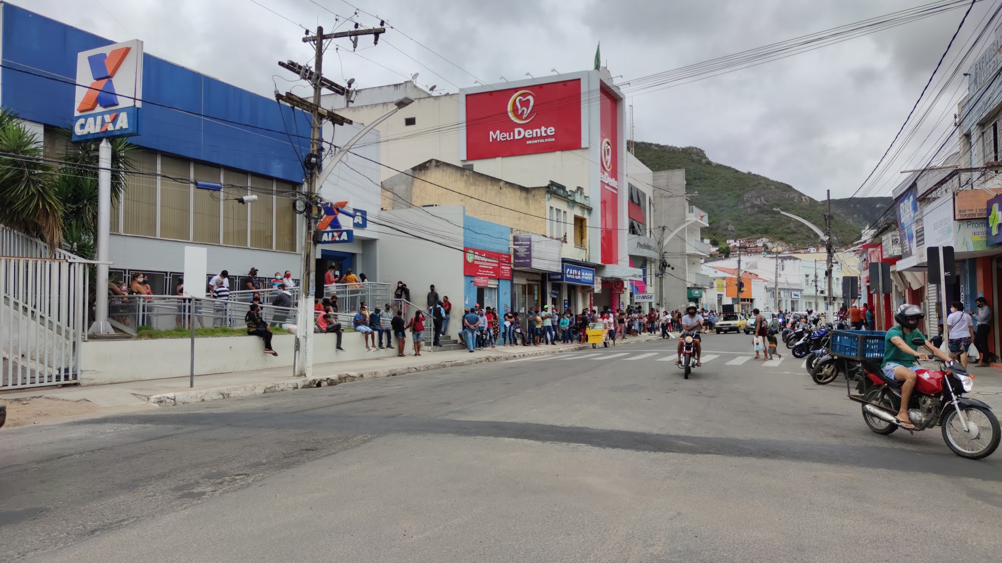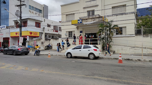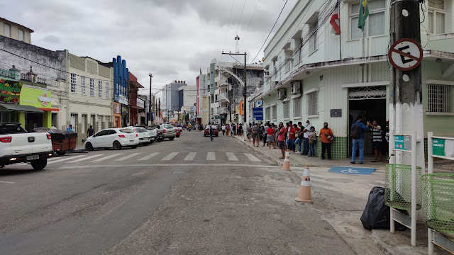 Na manhã desta terça-feira, 20 de outubro de 2020, centenas de pessoas segure em uma grande fila para atendimento na Caixa Econômica Federal na Rua Senador Pedro Lago no centro de Jacobina