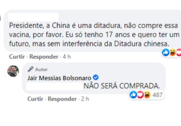 Um dia após o Ministério da Sáude anunciar que o Brasil compraria 46 milhões de doses da vacina chinesa, desenvolvida pela empresa chinesa Sinovac, em parceria com o Instituto Butantan, de São Paulo, o presidente Jair Bolsonaro respondeu a um apoiador em rede social que a vacina, na verdade, “não será compra