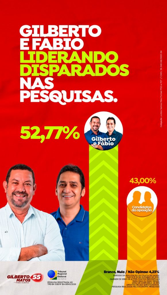 No Município de Caém a Coligação Juntos Somos Mais Fortes formadas pelos partidos PSD e PDT divulgou nesta terça-feira dia 27 de outubro uma pesquisa registrada junto ao TRE-BA sob o N.º 08143/2020; de acordo com o resultado oficial o atual prefeito e candidato à reeleição Gilberto Matos que tem como companheiro de chapa Fábio Queiroz lideram a campanha com 52,77% da intenção de votos, com o segundo colocado Arnaldinho Oliveira obtendo 42%.