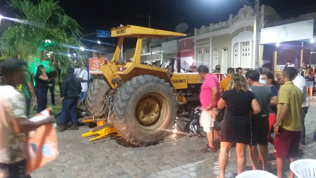 O condutor de um trator, perdeu o controle da direção e atropelou um casal que estava em uma moto em frente ao Ponto do Acarajé, na praça Lauro de Freitas, centro de Miguel Calmon-BA, durante a passagem de uma carreata, na noite desta sexta-feira (30).