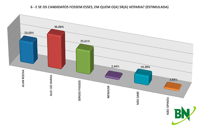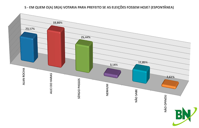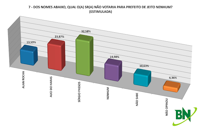 Os dados sobre o cenário de rejeição, em que os eleitores respondem em quem não votariam de jeito nenhum, Sergio Passos fica com o maior índice: 32,58%. Auci do Haras tem 23,87% e Alan Rocha 13,59%. Aqueles eleitores que não escolheram nenhum representam 14,98%, não souberam 10,63% e não opinaram 4,36%.