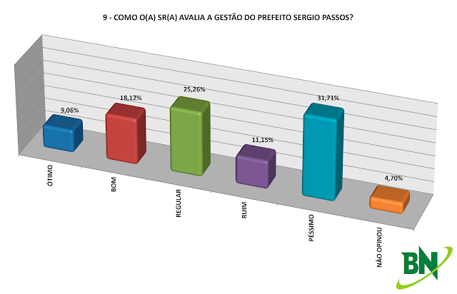Por fim os eleitores de Saúde avaliaram a administração do prefeito Sergio Passos. Para 31,71% a classifição apontada foi de "péssima" e 11,15% como "ruim".
