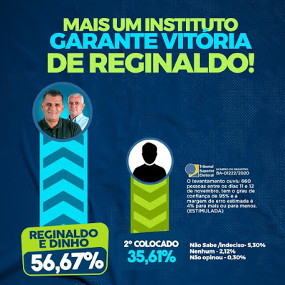 No cenário estimulado, o candidato Reginaldo Sampaio, lidera com 56,67%, enquando o candidato da oposição Dourenilson Firme (PP), tem 35,61%. Outros 7,72% entrevistados disseram está indeciso ou votar nulo.