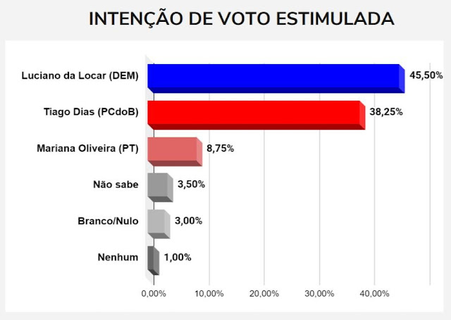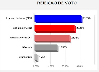 No cenário de rejeição, Luciado da Locar aparece com 31,75%. Tiago Dias 27,25% e Mariana Oliveira 23,75%. Não souberam responder 15,50% e optação por branco ou nulo 1,75%.
