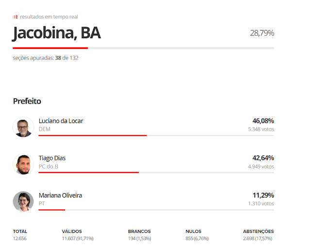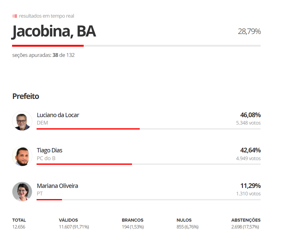 Com 38 urnas apuradas, Luciano da Locar aparece com 46,08%, Tiago Dias com 42,64% e Mariana com 11,29%.
