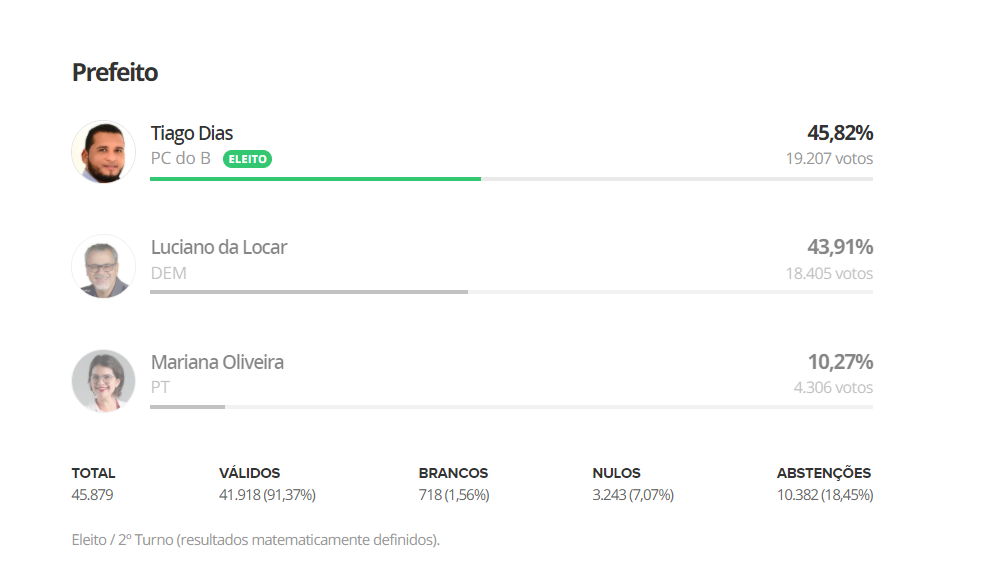 Luciano da Locar obteve 43,91% sendo 18,405 votos. Mariana Oliveira obteve 10,27%, sendo 4.306 votos.