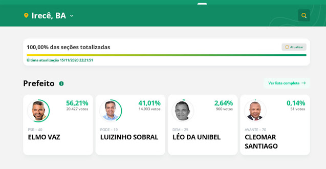 O atual prefeito do município de Irecê, na Chapada Velha, Elmo Vaz (PSB), foi reeleito com 56,21% dos votos e com quase seis mil votos de frente para o ex-gestor Luizinho sobral (Pode). Foram 20.427 eleitores que atestaram a administração do socialista neste domingo (15).