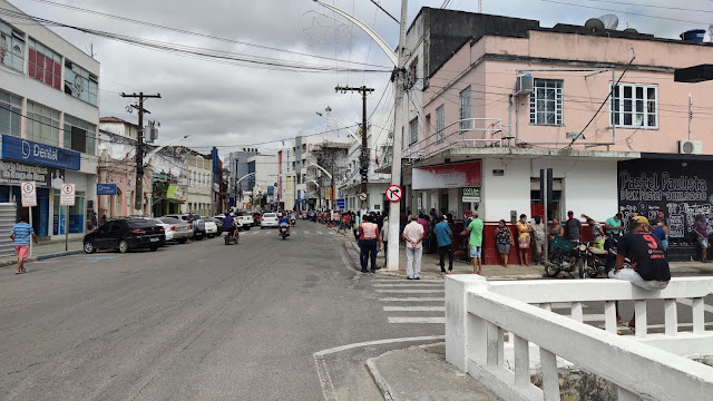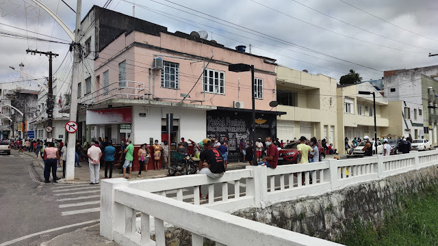 A mega fila, com pessoas que na maioria seguem em busca do auxílio emergencial, pega também parte da Rua Margem Rio do Ouro, esquina com a Praça Castro Alves.