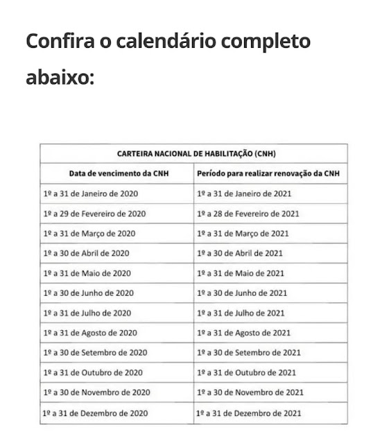 Segundo a nova resolução, os documentos de habilitação vencidos em 2020 ganharam mais um ano de validade. Com isso, a renovação das CNHs vencidas em 2020 ocorrerá de forma gradual, de acordo com um cronograma estabelecido no documento, de acordo com a Agência Brasil.