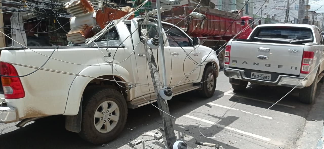 Na queda, o poste com o transformador acabou atingindo um veículo Hilux, destruindo parte da cabine e por muita sorte, houve apenas danos materiais, em uma manhã bastante movimentada no centro da cidade.
