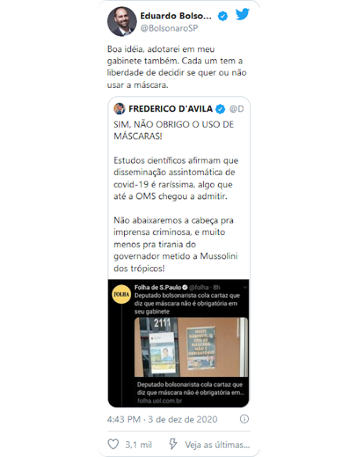 Eduardo Bolsonaro, por sua vez, retuitou a mensagem do colega, aprovando a iniciativa e dizendo que irá adotar o método. "Boa ideia, adotarei em meu gabinete também. Cada um tem a liberdade de decidir se quer ou não usar a máscara", reforçou Eduardo Bolsonaro.