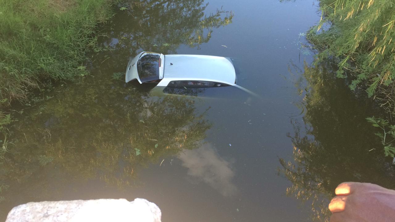 Houve apenas prejuízos materiais e o condutor tenta retirar o veículo da água, com ajuda de amigos.