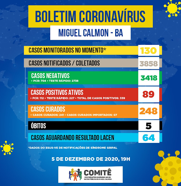 No município, outras 88 pessoas positivas estão ativas na data deste domingo (6), conforme boletim publicado pela prefeitura através da Secretaria de Saúde no dia 05 de dezembro.