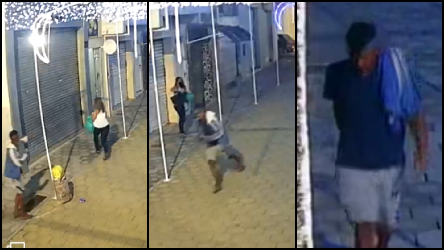 As imagens mostram o elemento usando blusa de frio, bermuda e corte de cabelo moicano entrando no Beco Guarani. Na sequência o elemento retorna com uma faca em punho e corre em direção da vítima, que acuada joga o seu celular ao chão, que é levado pelo elemento, que retorna correndo para o beco.