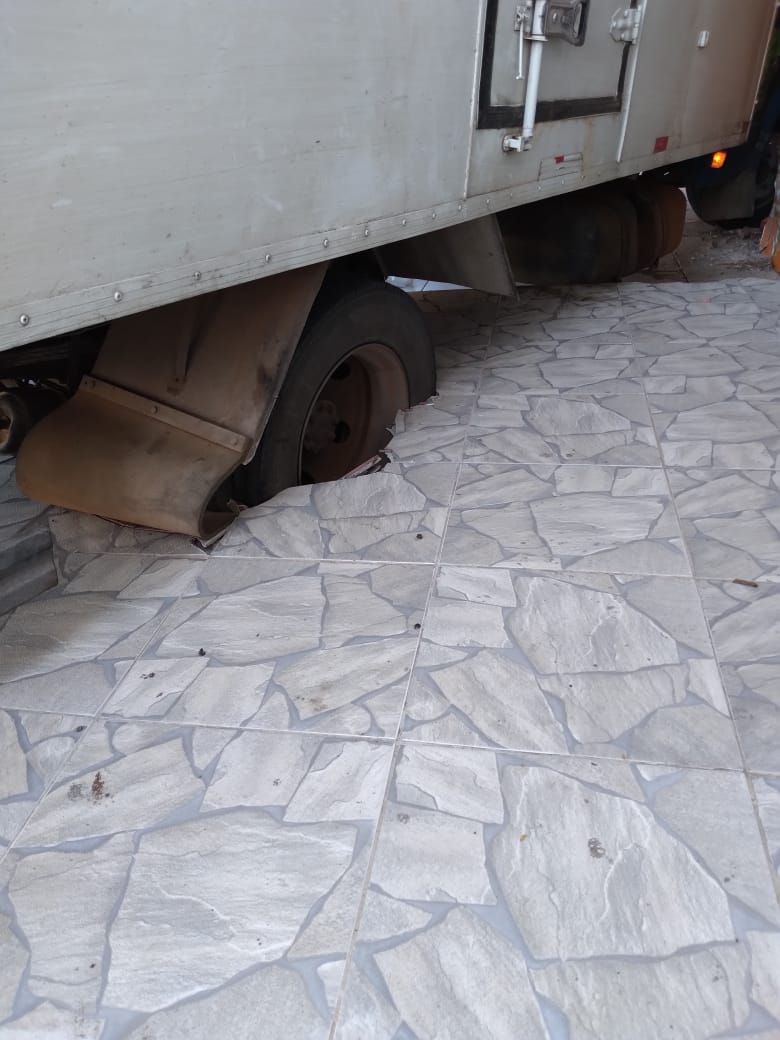 Segundo informações, o condutor parou na avenida para comprar água em um supermercado e o caminhão acabou descendo, atingindo os estabelecimentos, afundando também uma das rodas em uma fossa séptica.