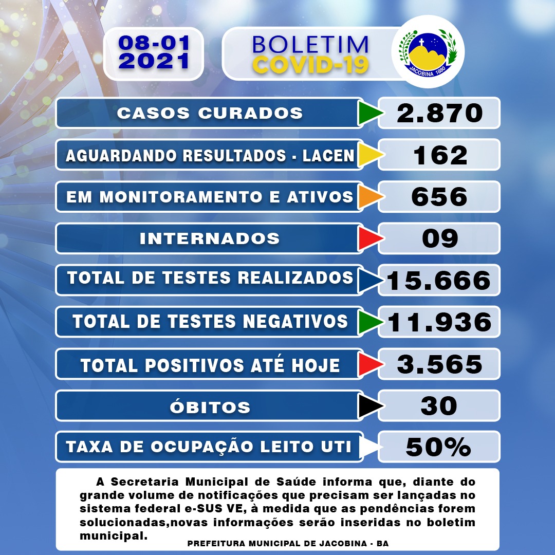 Na quinta-feira (7), em seu perfil pessoal, Tiago divulgou um boletim com os dados atualizados da doença no município até o dia 6 de janeiro. “Atualizando a Covid-19 após a Secretaria de Saúde trabalhar muito neste início de gestão. Recebemos a pasta com o site covid fora do ar e o Instagram oficial da PMJ apagado. Estamos construindo e tudo vai voltar a este novo normal”, escreveu.
