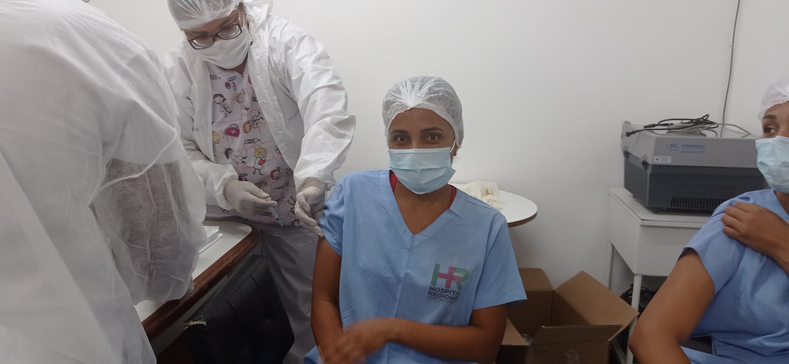 A enfermeira Nadiele da Silva, a técnica em enfermagem Andreia Maria Carvalho Oliveira e o Dr Leandro Carvalho foram os primeiros a serem vacinados contra a Covid-19 no Hospital Regional Vicentina Goulart em Jacobina, em um evento na tarde desta terça-feira, 19 de janeiro de 2021.