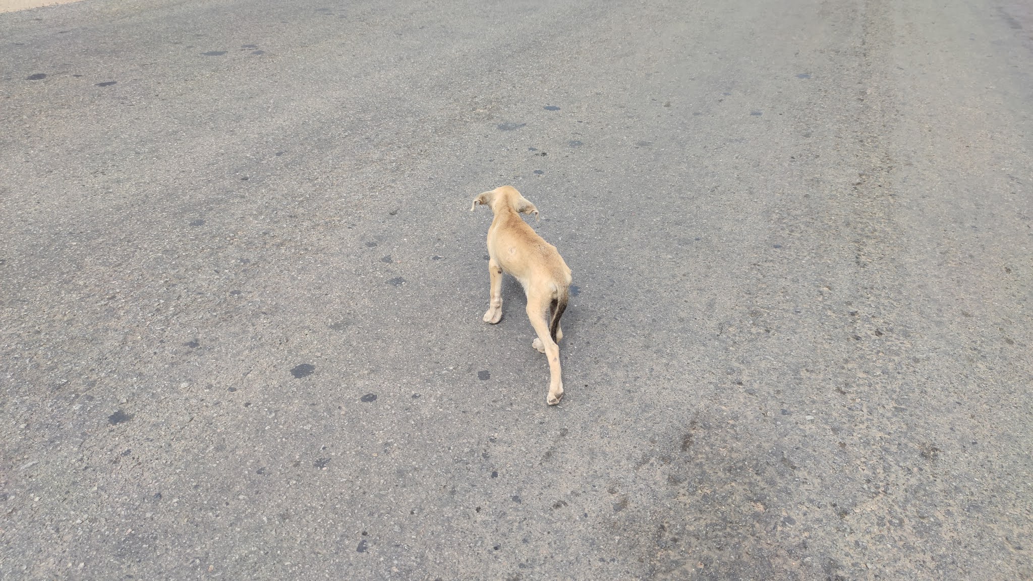 O cãozinho debilitado estava deitado no meio da pista e por sorte, um motorista conseguiu parar, evitando um atropelamento.
