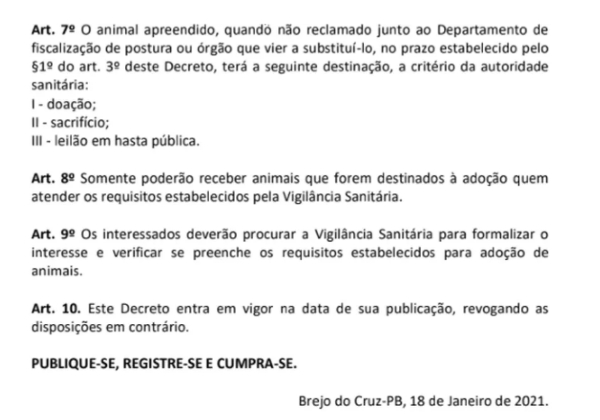 Um decreto da prefeitura de Brejo do Cruz, município da Paraíba, autoriza o sacrifício de animais soltos ou abandonados na rua e em espaços públicos.