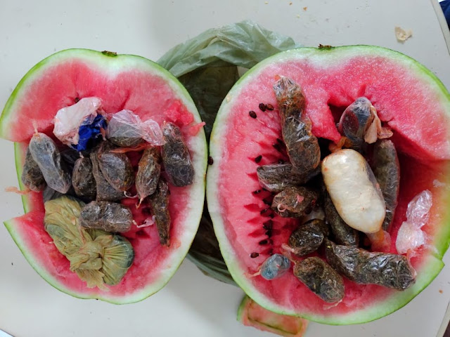Policiais da Delegacia Territorial (DT) de Morro do Chapéu, na Chapada Diamantina, flagraram, na tarde de quarta-feira (3), uma mulher, de 28 anos, que tentou entrar na unidade transportando cocaína, crack e maconha, além de um aparelho celular, dentro de uma melancia.