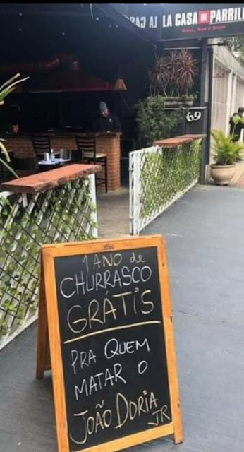 Restaurante na Vila Mariana, Zona Sul de SP, anuncia "churrasco grátis pra quem matar o João Doria", governador de São Paulo. — Foto: Acervo pessoal