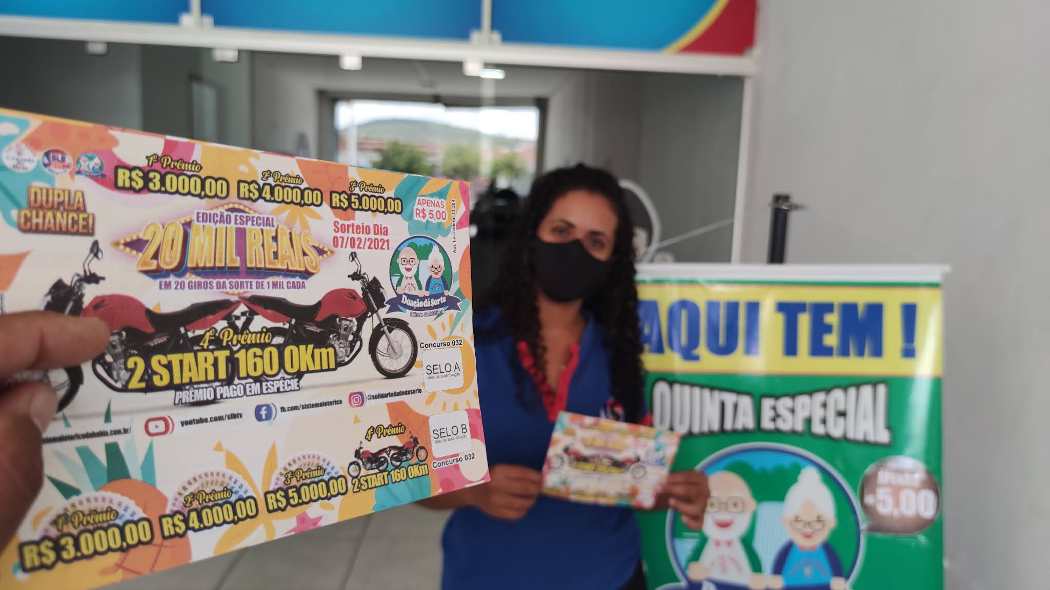 A jovem nos apresentou o bilhete do Doação da Sorte que estará sorteando muito dinheiro neste domingo (7), sendo uma moto 0Km Start no 4⁰ prêmio, além de R$ 20.000,00 em 20 giros da sorte para você.