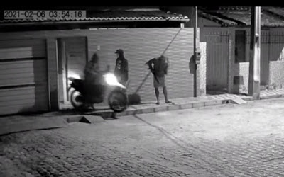 Foi registrado ainda pela câmera o momento em que a motocicleta é levada pelo portão da frente. Os quatro elementos fogem montado na moto.