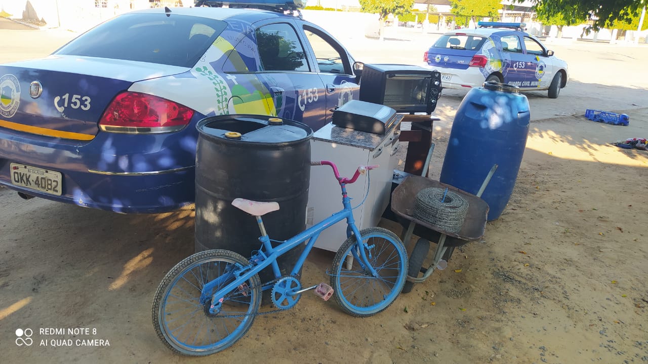 A Guarda Municipal foi acionada e conseguiu localizar o jovem através do seu pai e com o mesmo foram recuperados forno elétrico, bicicleta, bola de arame, tambores de 250 ml, aparelho de som, rack, armário de cozinha e um carrinho de mão.