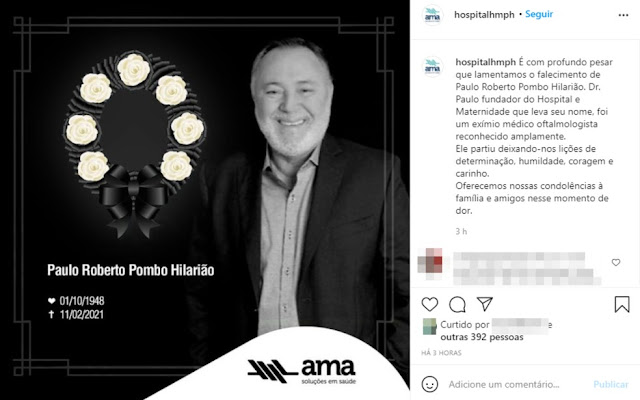 "É com grande pesar que lamento o falecimento do médico oftalmologista Paulo Roberto Hilarião, fundador do Hospital e Maternidade Paulo Hilarião, ocorrido nesta quinta-feira (11). Meus sentimentos a todos familiares e amigos!", disse o prefeito.