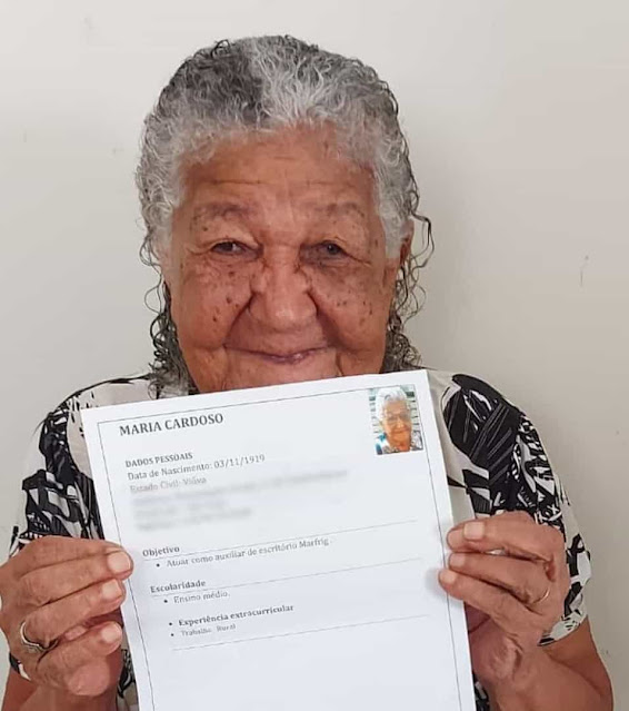 Maria Cardoso indicava que queria trabalhar para ajudar a família com a alimentação. "Eu quero trabalhar para comprar meus 'vinhozinhos', minha 'carninha', para não depender só da filha, ajudar um pouco", dizia a senhora, sendo que a família a ajudou a preparar o currículo, ainda que mais por brincadeira.