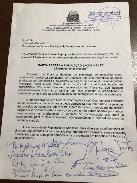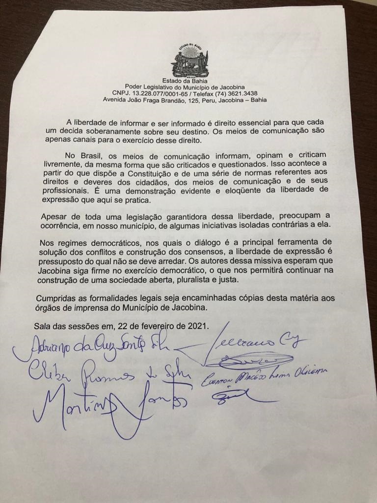 Numa “Carta Aberta à População Jacobinense”, os vereadores manifestaram solidariedade e apoio incondicional ao trabalho da imprensa no município de Jacobina. .