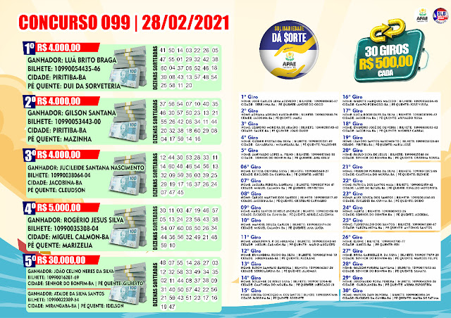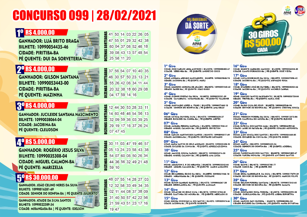 Neste domingo, 28 de fevereiro de 2021, o Sistema Lotérico da Bahia (SLB) esteve realizando o 99º concurso do Solidariedade da Sorte em sua sede na Avenida Orlando Oliveira Pires no centro de Jacobina.