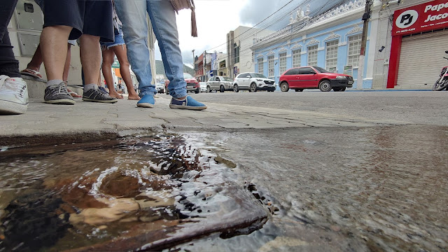 Manhã de segunda-feira, 1⁰ de março de 2021, e aqui na Rua Senador Pedro Lago em Jacobina, há um vazamento de água potável, na altura do número 104.