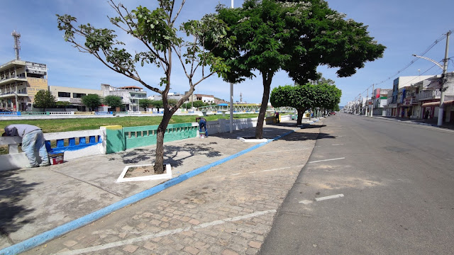 Manhã de domingo, 28 de março de 2021, e aqui na Avenida Orlando Oliveira Pires em Jacobina, prepostos da Prefeitura Municipal seguem pintando a balaustrada, o cais e a Passarela da Amizade.