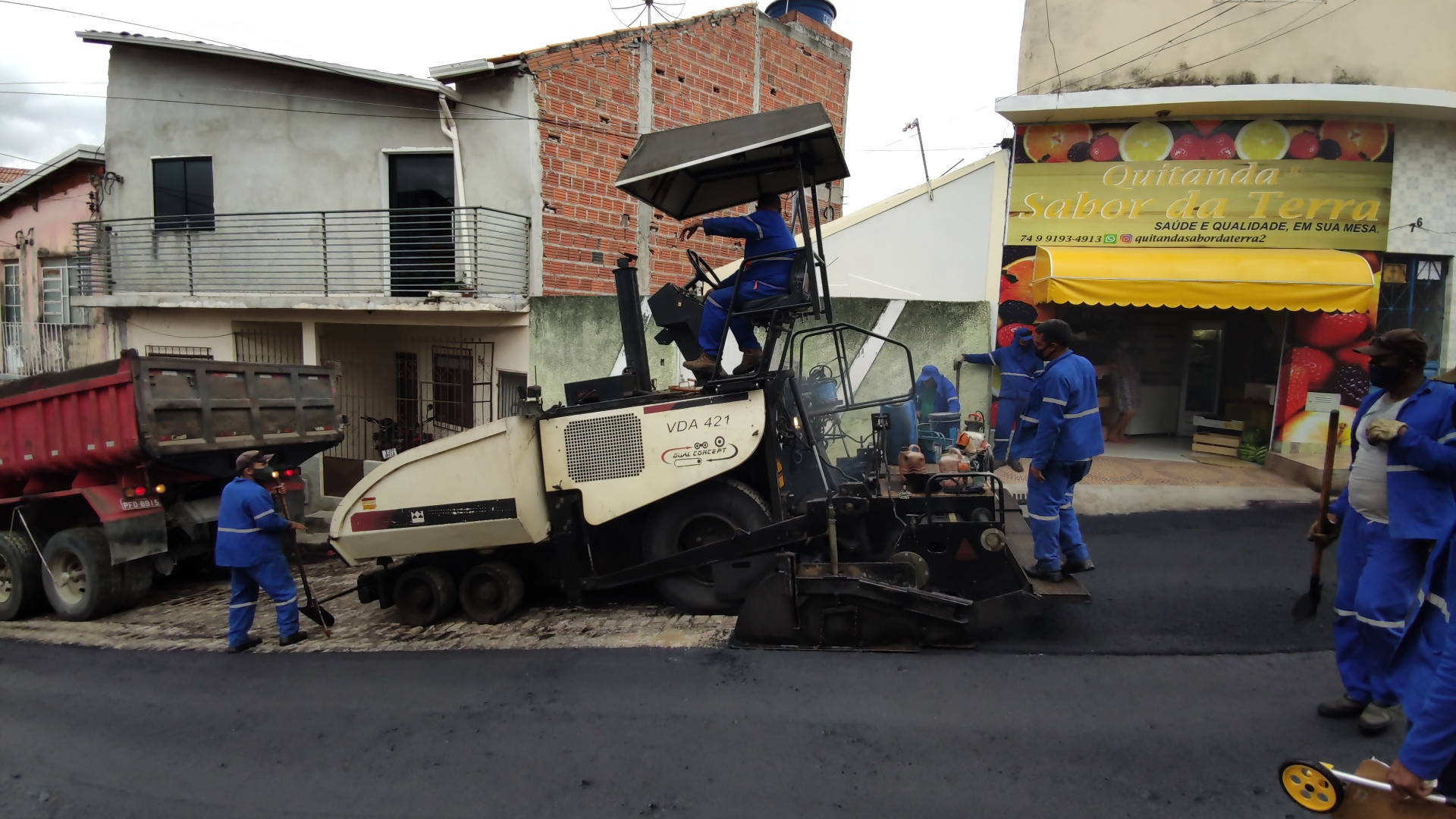 Na manhã desta quarta-feira, 07 de abril de 2021, homens e máquinas trabalham no serviço de pavimentação asfáltica na Rua João Batista Freitas Matos, no Bairro Félix Tomaz em Jacobina.