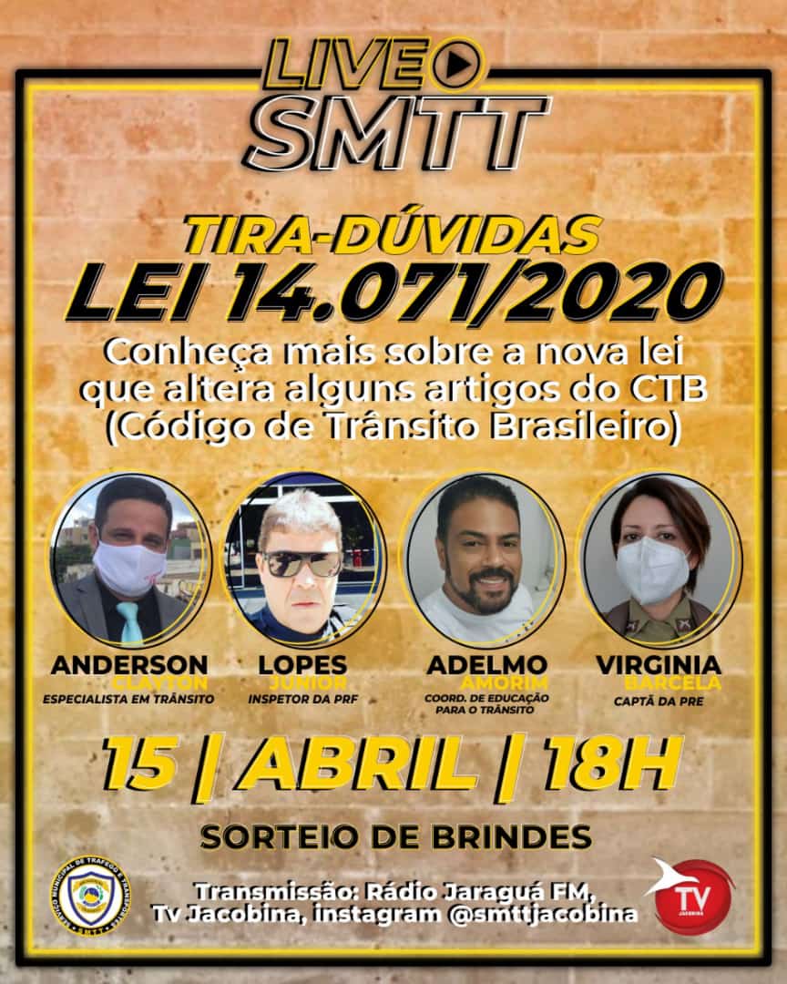 O Serviço Municipal de Tráfego e Transporte-SMTT, estará realizando quinta-feira dia (15), às 18h a live SMTT Tira Dúvidas concernente a lei 14.071/2020 que entrou em vigor no dia 12/04 e altera alguns artigos do Código de Trânsito Brasileiro (CTB).