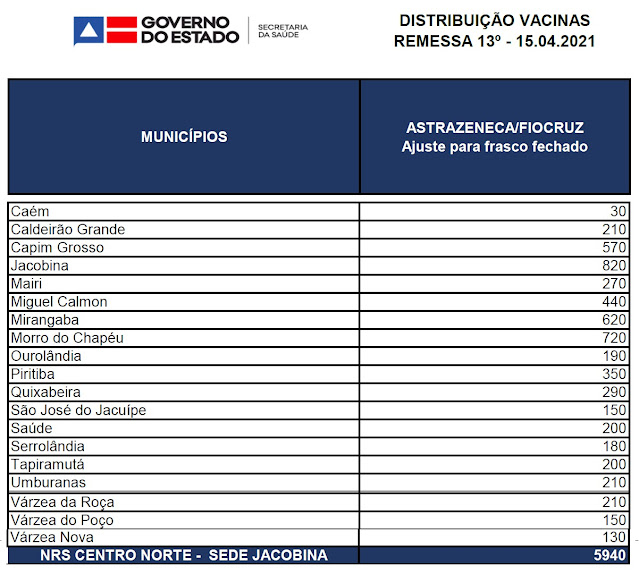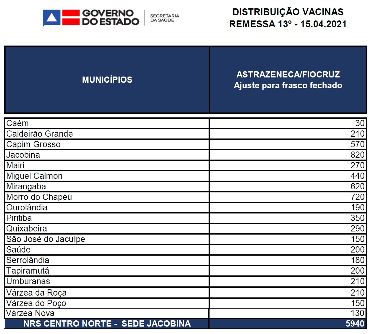 Para o município de Jacobina foram 820 doses, o que possibilitou avançar a vacinação para a faixa etária de 61 anos.