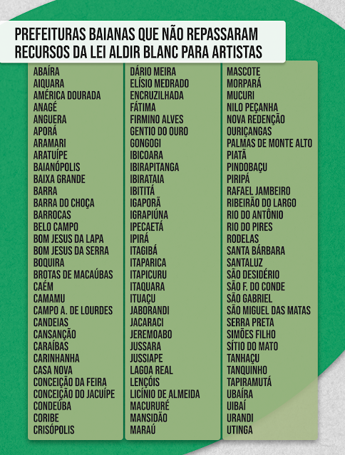 No levantamento que reúne as localidades que receberam as maiores verbas para socorro ao meio artístico e não foram direcionadas, logo depois de Simões Filho aparecem Candeias - também na RMS -, que deixou de aplicar mais de R$ 622,8 mil; e Casa Nova, que não direcionou mais de meio milhão de reais do que foi recebido da União.