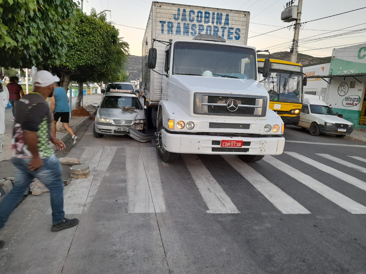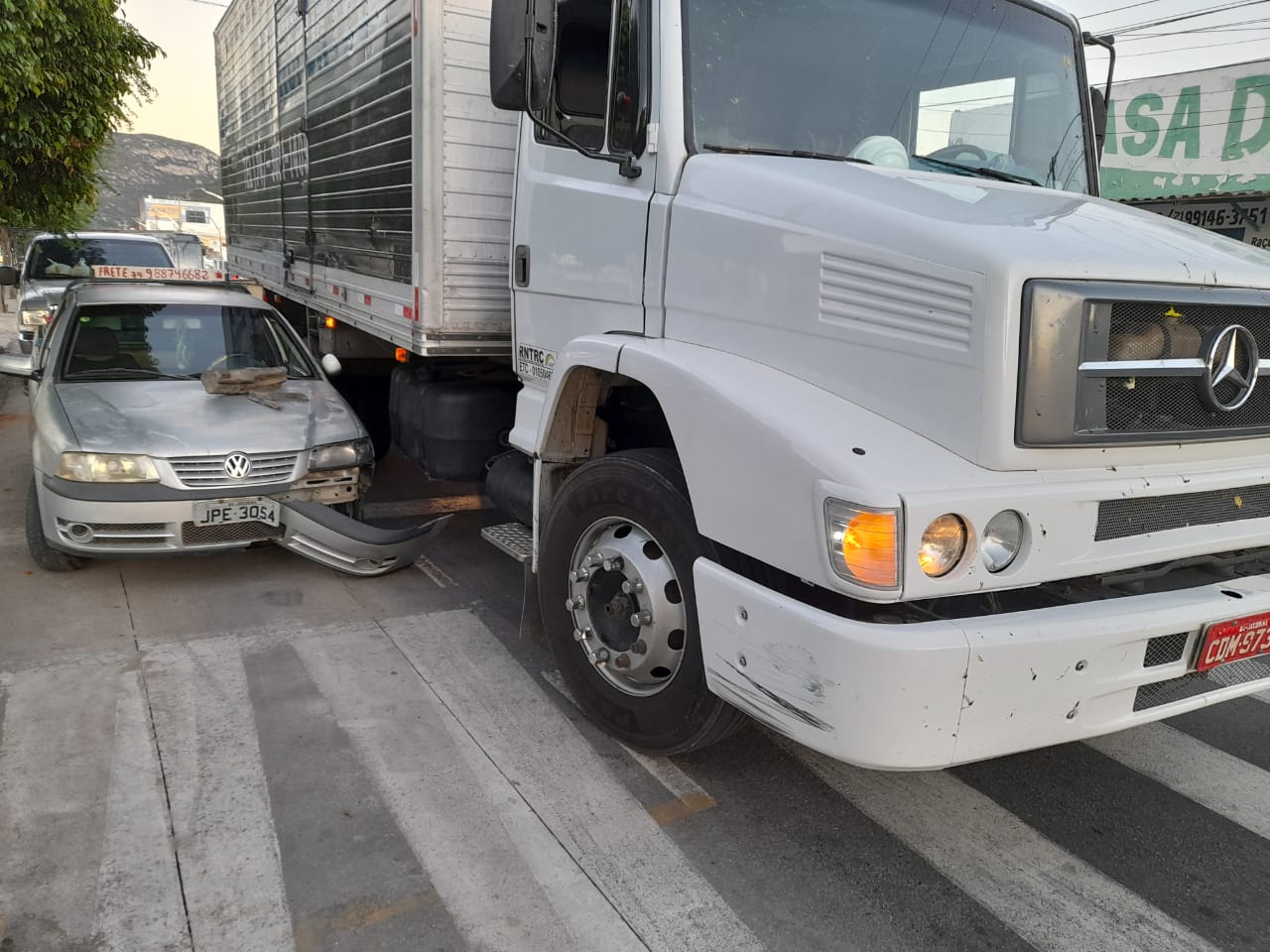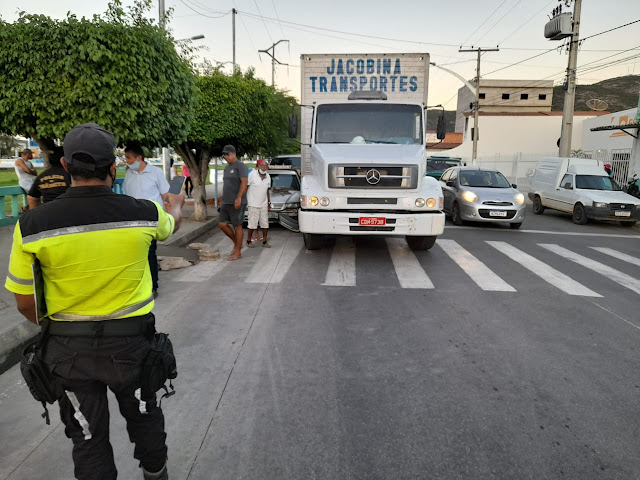 No final da tarde desta quarta-feira, 28 de abril de 2021, foi registrada uma colisão lateral entre um caminhão baú e um Saveiro na Avenida Lomanto Júnior, altura do semáforo da passarela da feira em Jacobina.