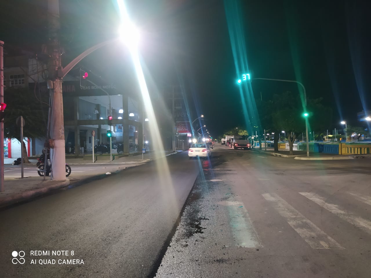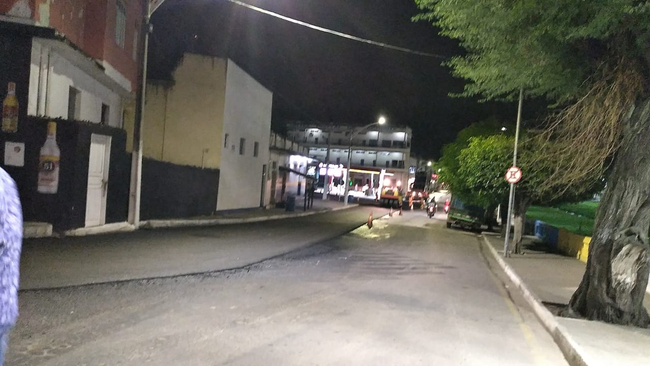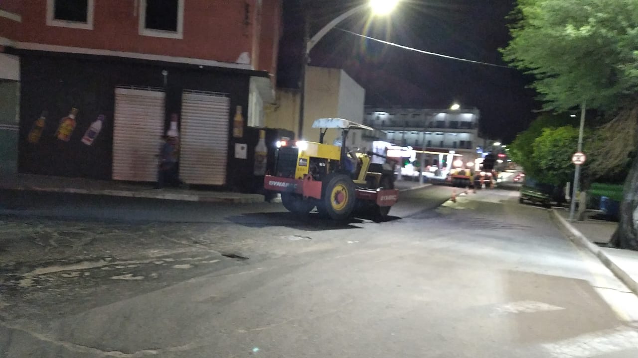 Na noite desta terça-feira, 11 de maio de 2021, homens e máquinas trabalham na aplicação de camada asfáltica na Avenida Lomanto Jr, no centro da cidade de Jacobina.