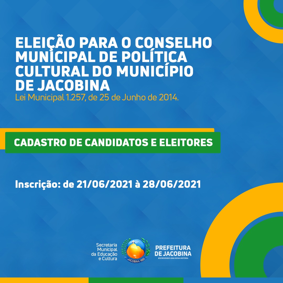 As inscrições para candidatos e eleitores foram abertas de 21 a 28 de junho de 2021, no site oficial da Prefeitura de Jacobina, veja clicando AQUI!