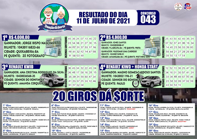 Neste domingo, 11 de julho de 2021, o Sistema Lotérico da Bahia (SLB) realizou o 43⁰ do Doação da Sorte em sua sede na Avenida Orlando Oliveira Pires em Jacobina.