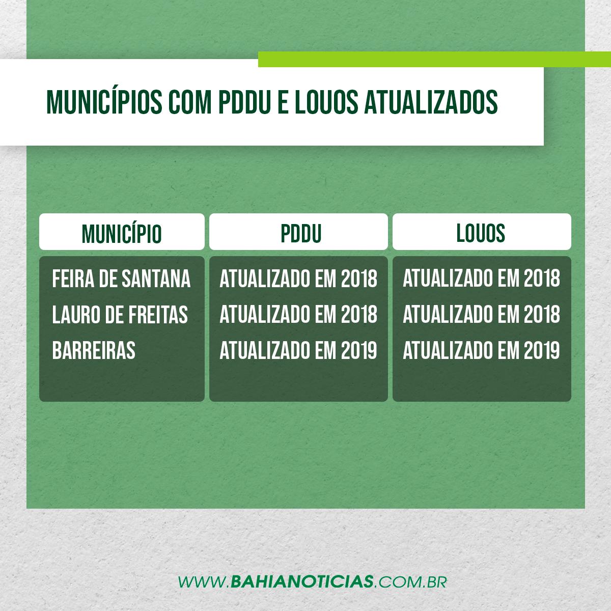 A cidade de Lauro de Freitas, na Região Metropolitana de Salvador (RMS), atualizou os instrumentos legais no ano de 2018. Mesmo período em que Feira de Santana, no Portal do Sertão, atualizou o PDDU e a Louos. De acordo com o secretário de Planejamento de Feira, Carlos Brito explica que mesmo assim uma atualização está sendo feita. “Em função da própria dinâmica do município que tem crescido muito rápido apesar da crise”, disse.