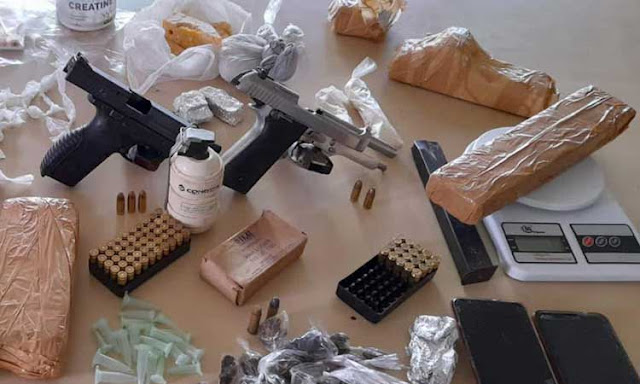Duas pistolas calibre 9 milímetros – uma delas de fabricação turca – uma granada, quatro balaclavas, drogas e munições foram apreendidas por equipes do 19º Batalhão da Polícia Militar (BPM/Jequié), no final da manhã desta quinta-feira (5), no município de Jaguaquara, Sudoeste do estado. Quatro pessoas foram localizadas – uma delas com dois mandados de prisão em aberto por tráfico de drogas.
