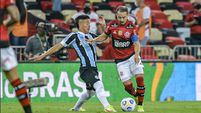 Muito fechado e com marcação forte (às vezes exagerada), o Tricolor gaúcho aproveitava espaços para arriscar contra-ataques. Só que as chances se esvaíam também por erros. Borja esticou até Léo Pereira, mas o meia-atacante parou na zaga rubro-negra. Em seguida, Jhonata Robert surgiu na área após receber lançamento e furou diante de Matheuzinho. Já Fernando Henrique passou como quis pelo meio e pegou mal na bola ao concluir. Em uma cobrança de escanteio, Borja desviou e a defesa do Flamengo se antecipou bem.