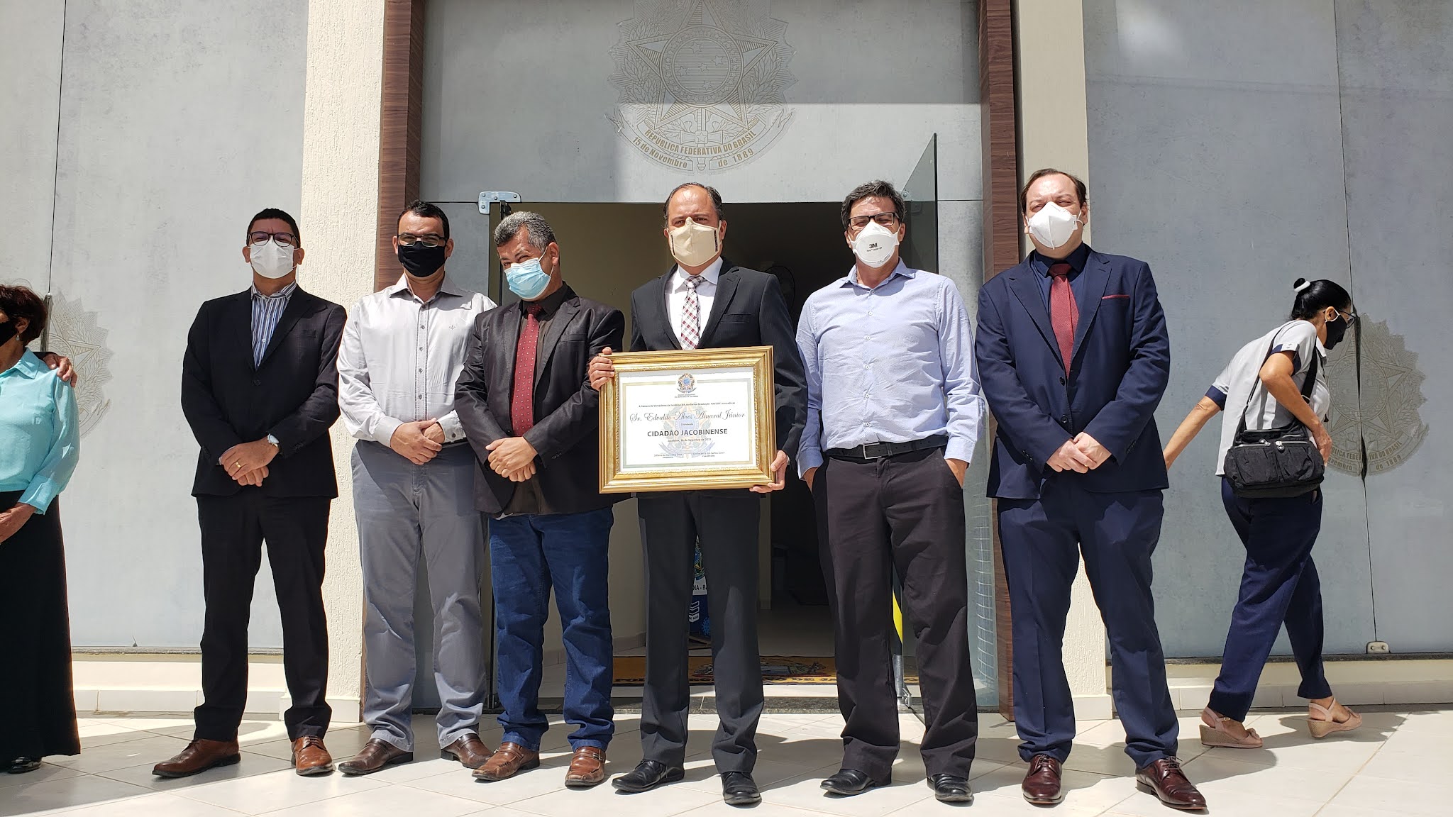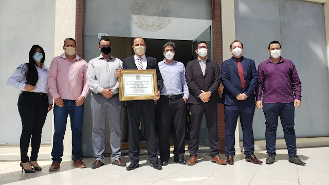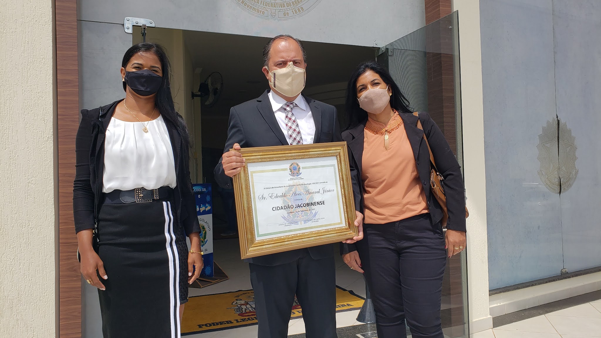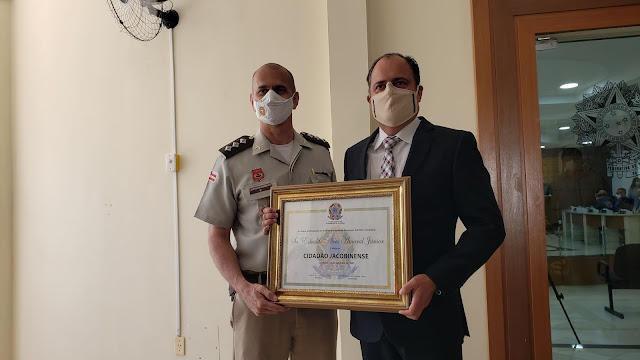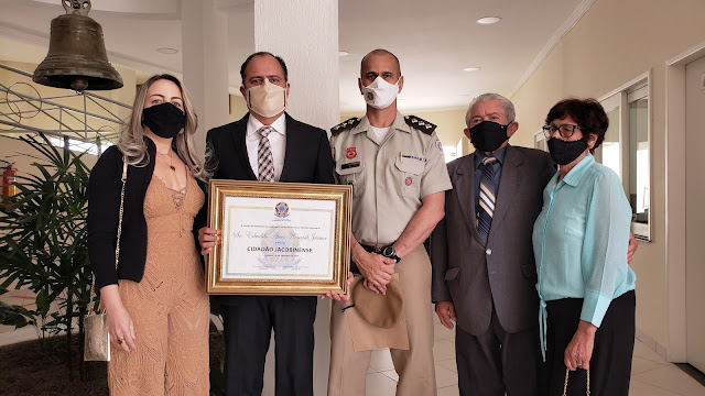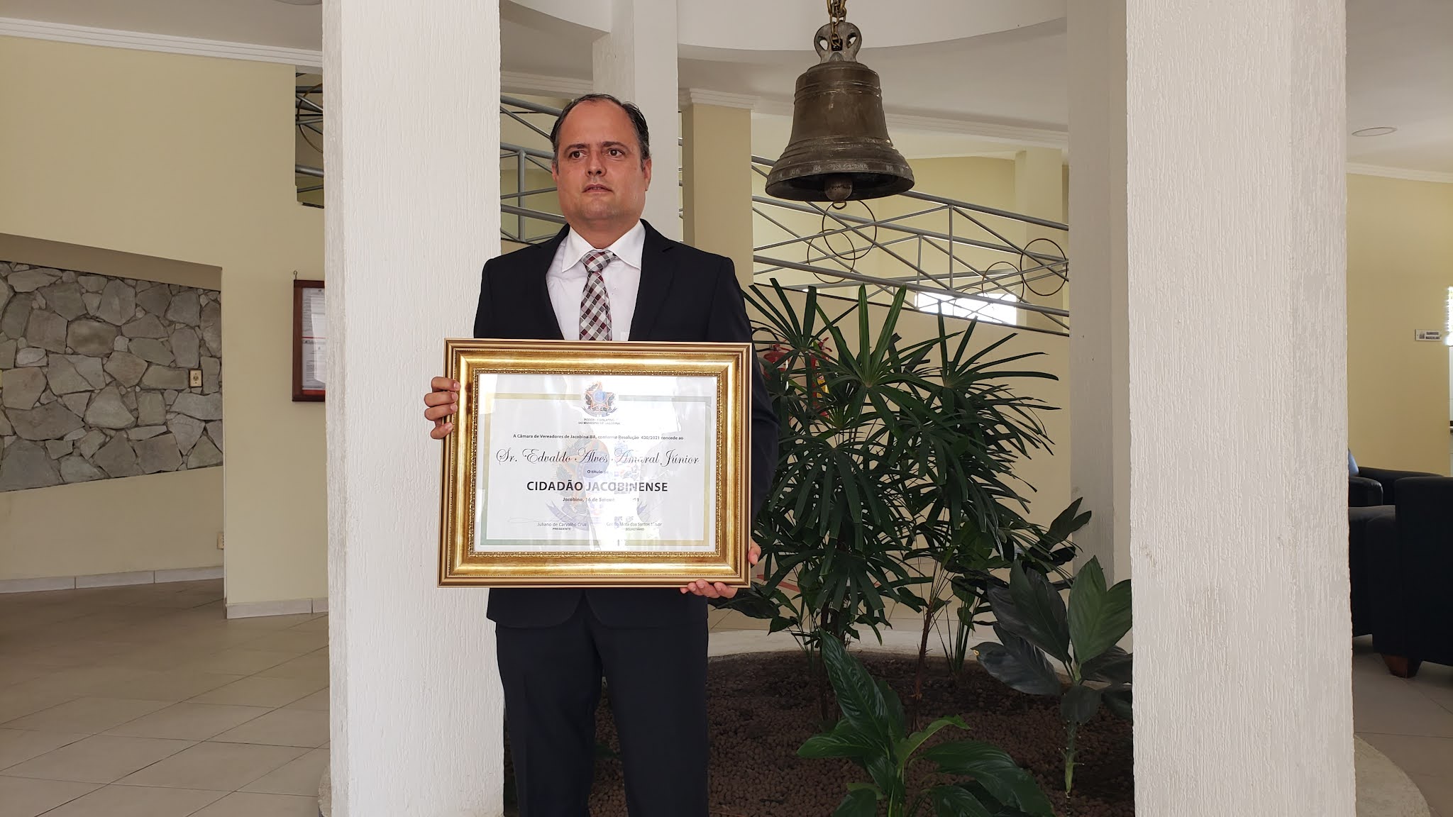 Na manhã desta quinta-feira (16) Edvaldo Alves Amaral Junior, gerente geral da Jacobina Mineração e Comércio, empresa da Yamana Gold, recebeu na Câmara Municipal o título de Cidadão Jacobinense. Propositura do vereador Clodoaldo Moreira (Cidadania), a homenagem registra a gratidão dos jacobinenses aos relevantes serviços do laureado à comunidade, especialmente durante a pandemia da Covid-19.