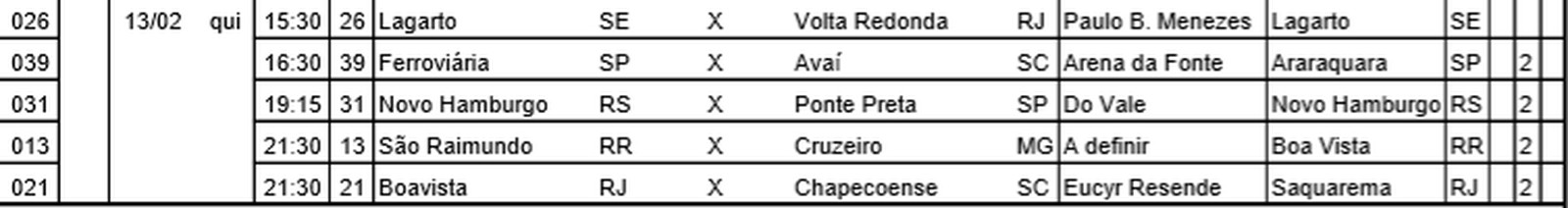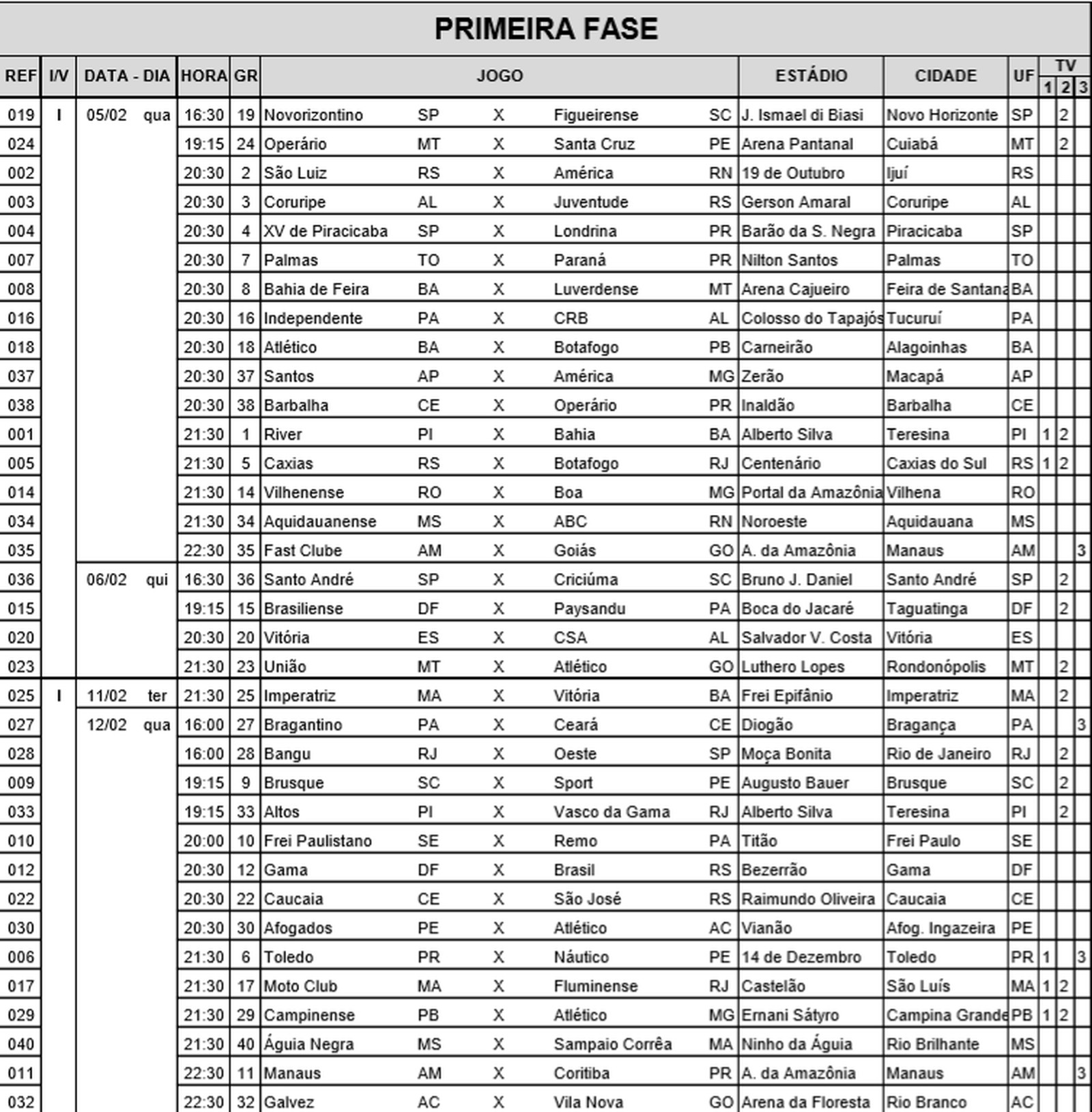 A CBF divulgou na tarde desta sexta-feira, 10, a tabela detalhada da Copa do Brasil. Foram definidos todas as datas, horários e locais das partidas válidas pela primeira fase da competição, que começa a ser disputada no dia 5 de fevereiro.