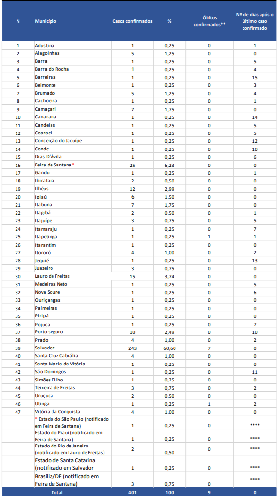 Diferente do divulgado no boletim anterior, os municípios de Mairi e Capim Grosso não registraram casos positivos de Covid-19. Os casos em questão eram de Salvador. Estes números representam notificações oficiais compiladas pelo Centro de Informações Estratégicas em Vigilância em Saúde da Bahia (Cievs-BA), em conjunto com os Cievs municipais.
