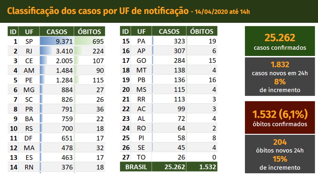 Já o número de casos somou 25.262, o que representa um crescimento de 8% em relação a ontem, quando o balanço do Ministério da Saúde registrou 23.430. No comparativo com domingo (12), quando foram identificadas 22.169 pessoas infectadas, o aumento significou 14%.