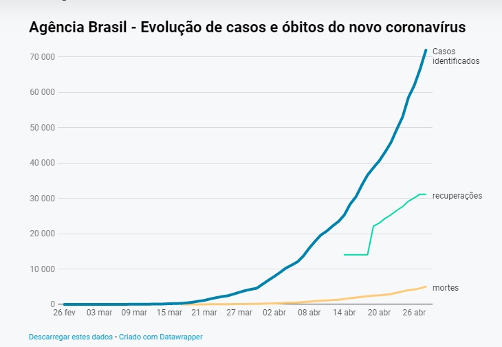 O Brasil chegou a 71.886 pessoas infectadas. Nas últimas 24 horas foram adicionadas às estatísticas mais 5.385 casos, aumento de 8,1% em relação a ontem, quando foram registradas 66.501 pessoas nessa condição. Foi o segundo maior número em um dia, perdendo apenas para o sábado (25), quando foram acrescidos 5.514 novos casos ao balanço.